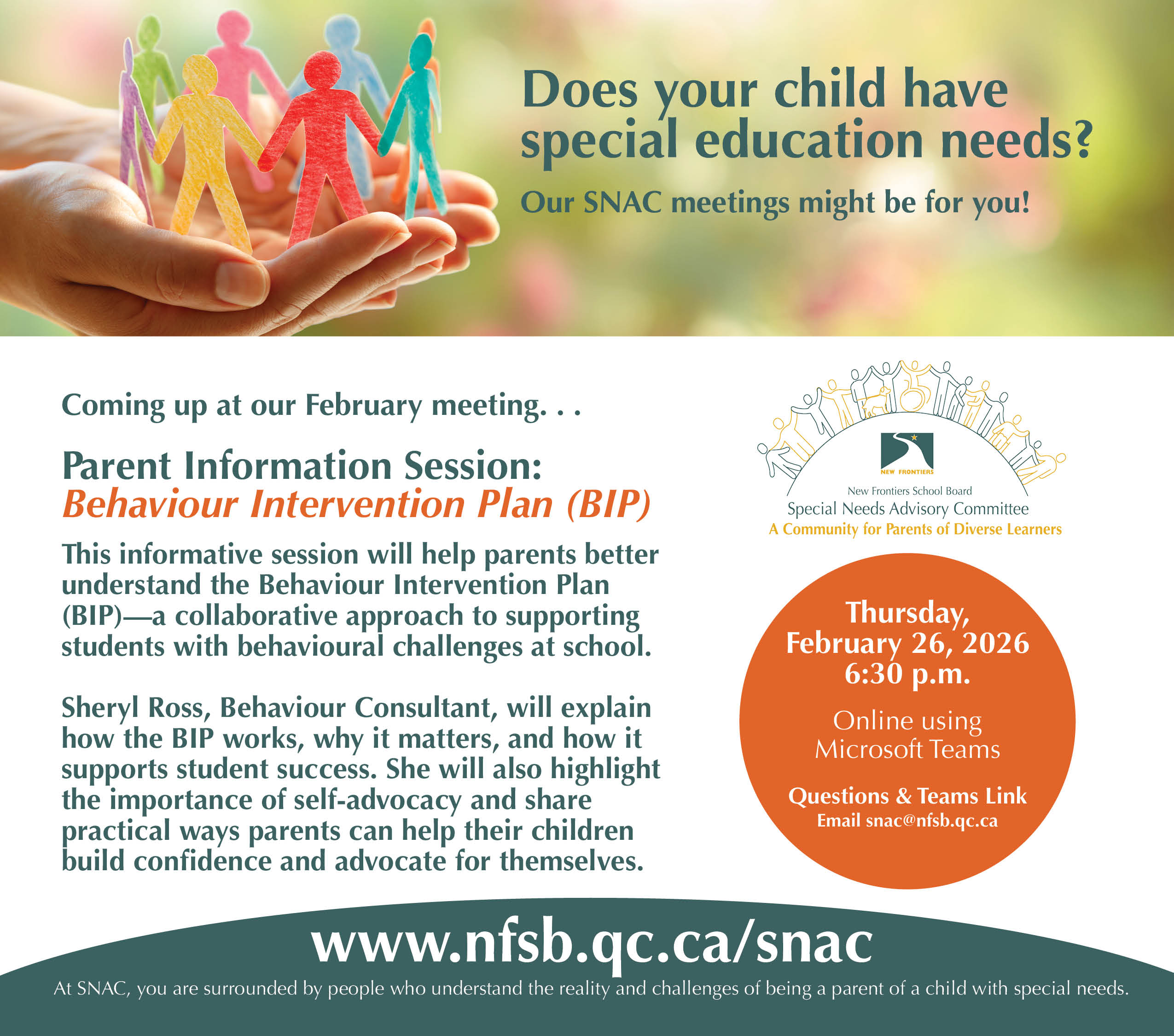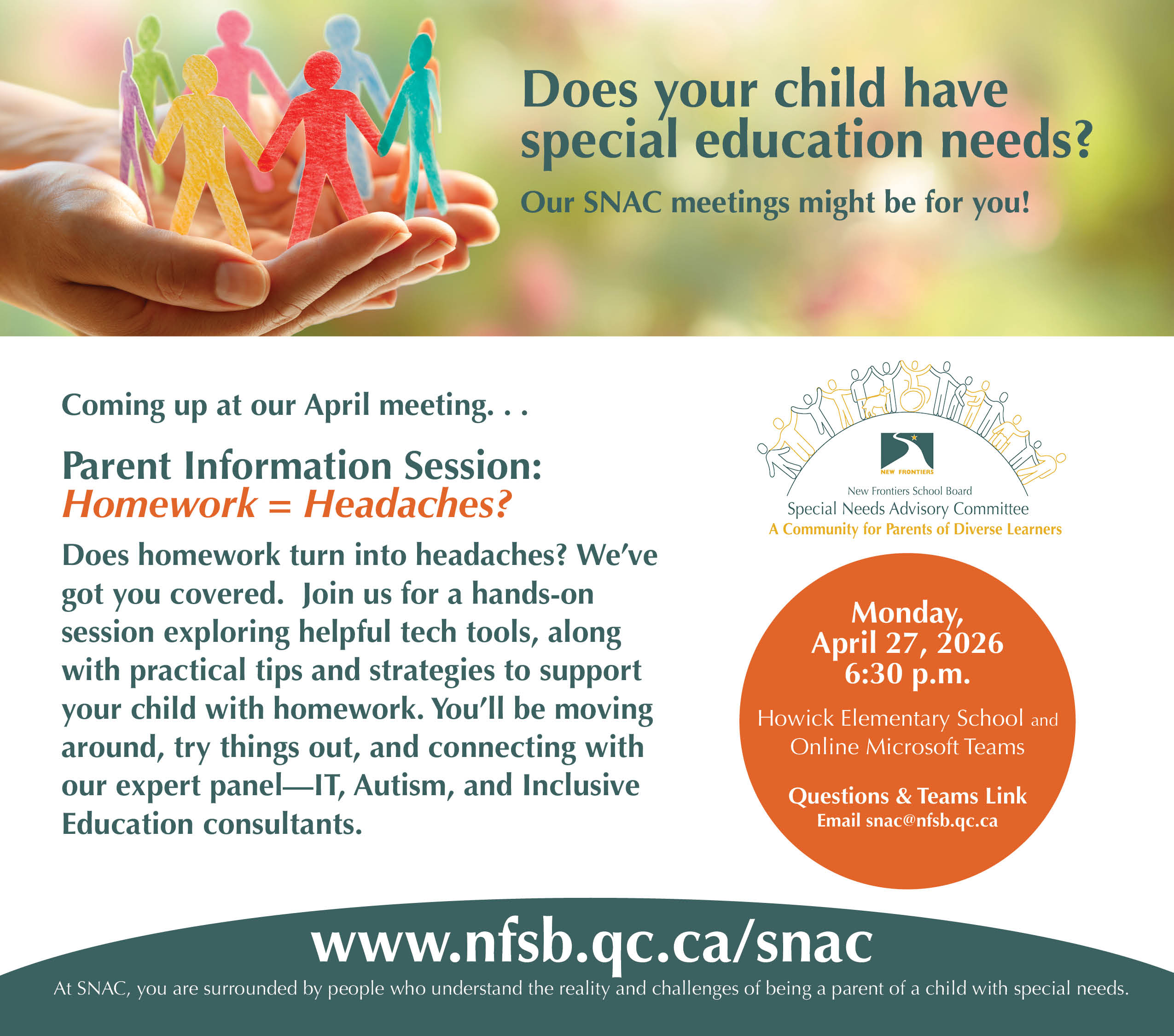 The Special Needs Advisory Committee (SNAC) is a parent-led group that partners with the NFSB) to advocate for and support students with special needs. Mandated by Quebec’s Education Act, SNAC plays a vital role in shaping educational policies and ensuring that families have a voice in the services their children receive.
